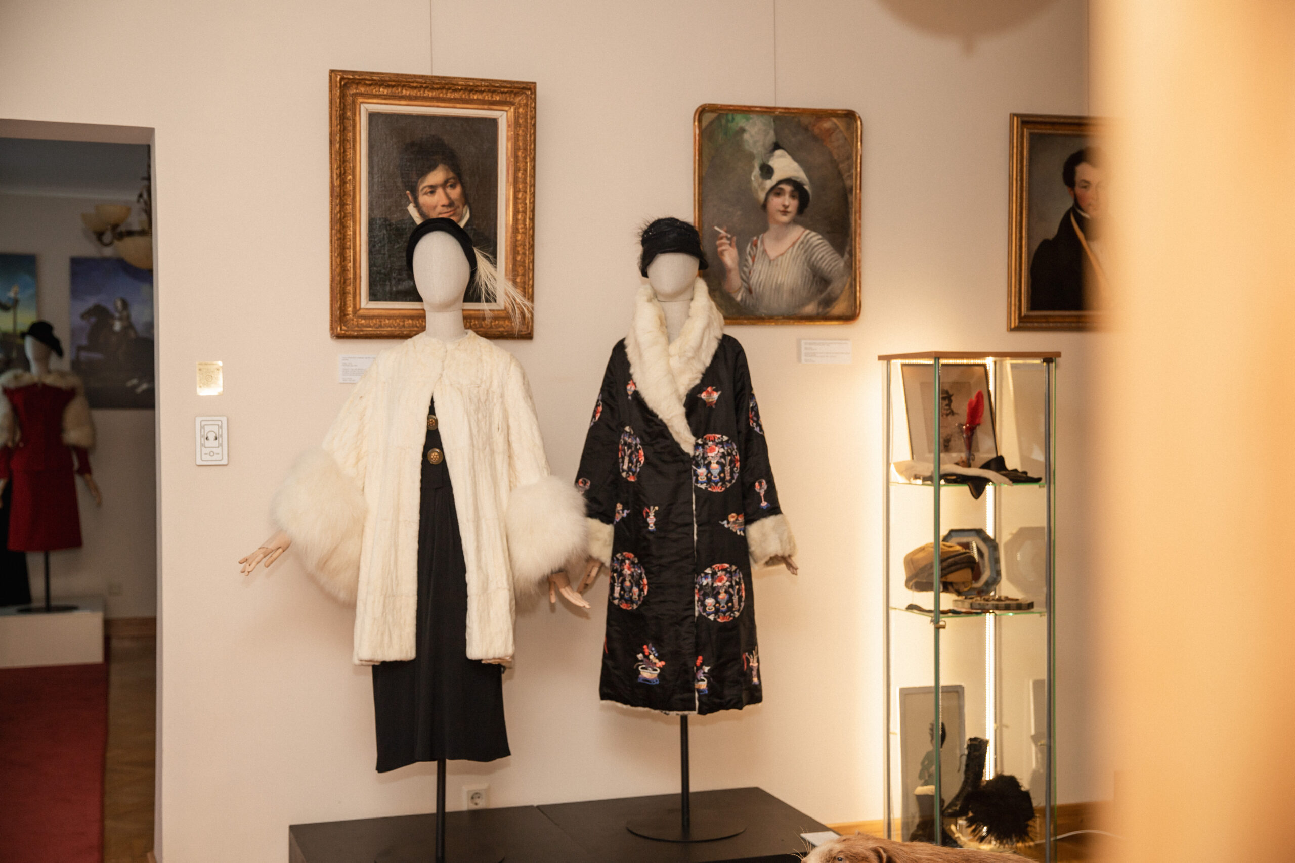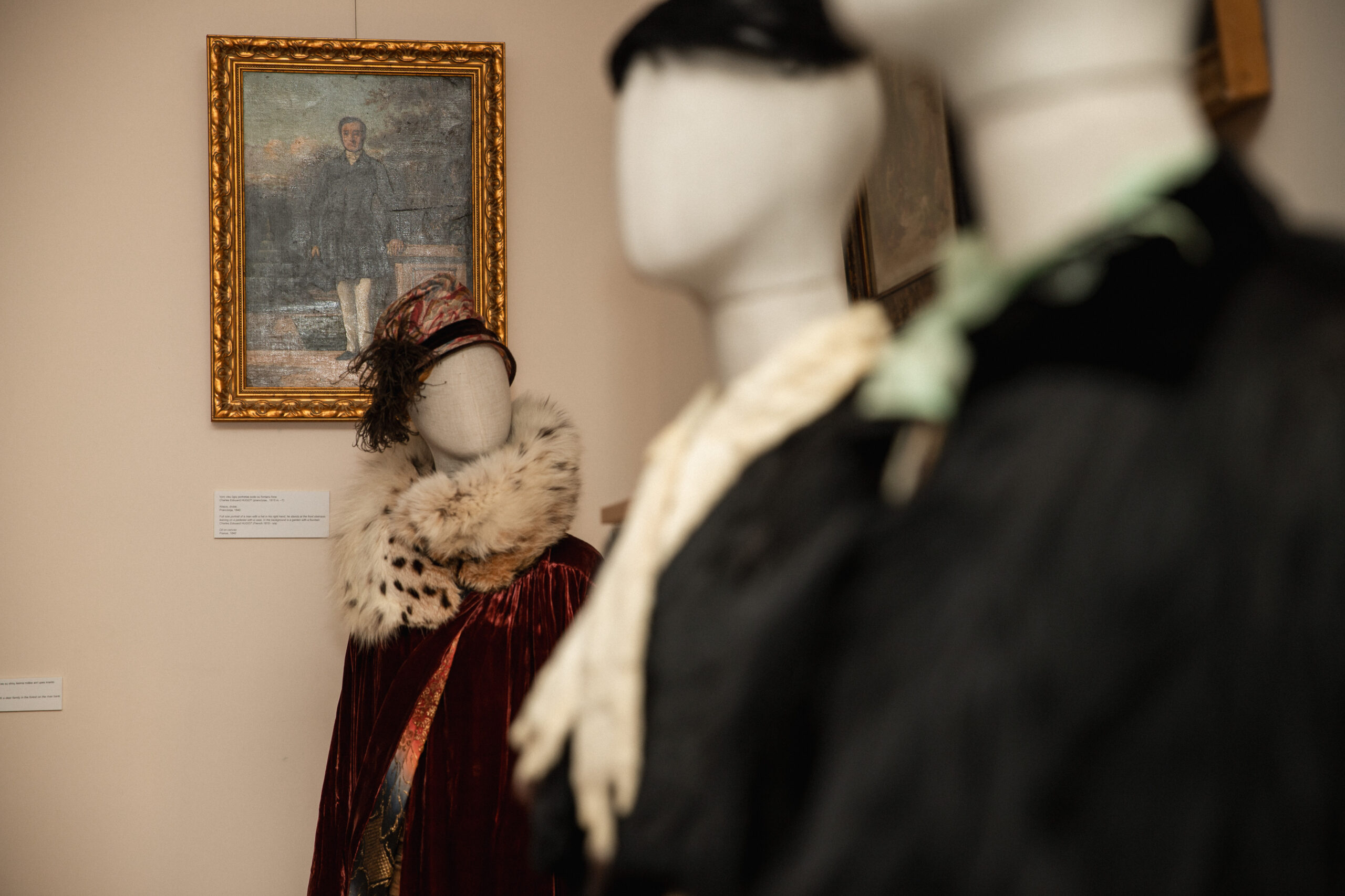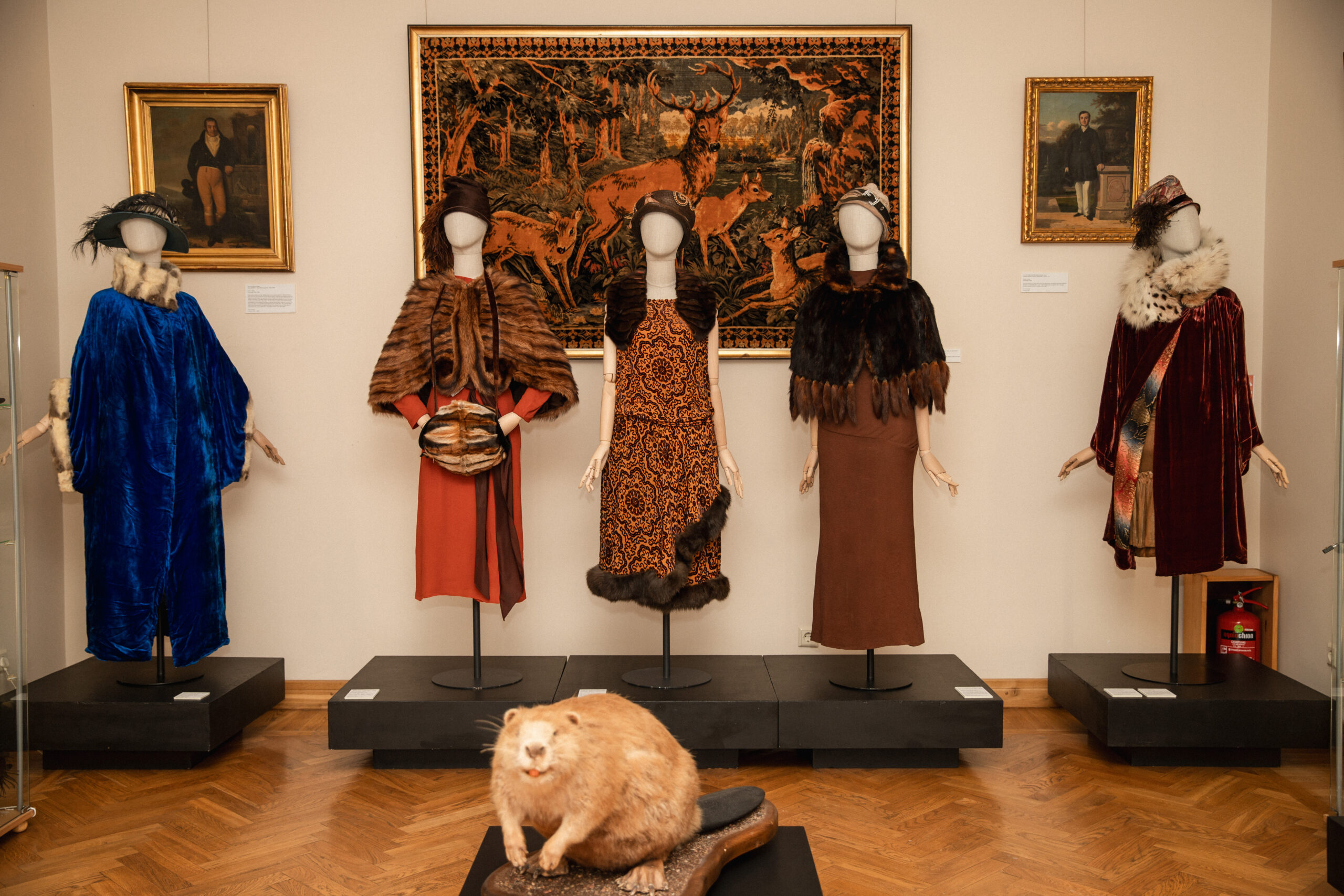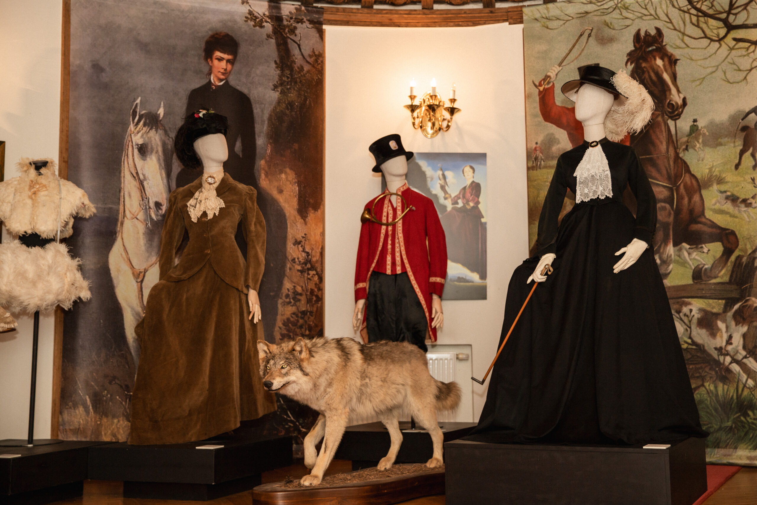 Tarp kūrėjų vardų – tokie mados istorijos grandai kaip Worth, Patou, Lanvin, Molyneux, Maggie Ruff ir Redfern. Parodoje pristatomos XIX a. amazonės, XVIII a. lakėjų livrėjos, XX a. pradžios medžioklės kostiumai, medžioklinės skrybėlaitės, kailinės goržetės, orangutano kailio pelerina, šiltos movos, šermuonėlių apykaklaitės, odinės rankinės, pirštinės, karoliukų siuvinėjimai medžioklės tematika, egretės iš šerno šerių, taip pat gyvūnų ir paukščių iškamšos.