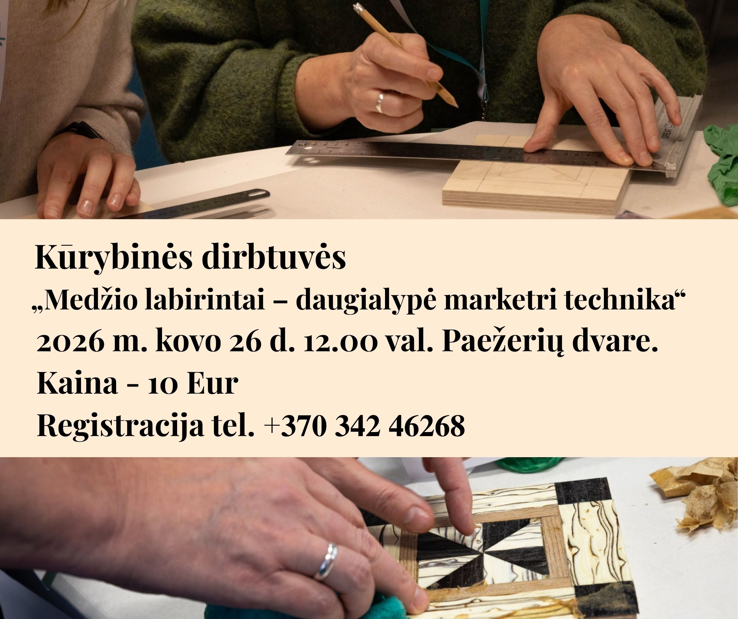 Dirbtuvės skirtos visiems, besidomintiems istoriniu dizainu, amatais, medžio apdirbimu ar tiesiog norintiems kūrybiškai praleisti laiką. 𝐕𝐢𝐞𝐭𝐮̨ 𝐬𝐤𝐚𝐢𝐜̌𝐢𝐮𝐬 𝐫𝐢𝐛𝐨𝐭𝐚𝐬. 𝐁𝐮̄𝐭𝐢𝐧𝐚 𝐢𝐬̌𝐚𝐧𝐤𝐬𝐭𝐢𝐧𝐞̇ 𝐫𝐞𝐠𝐢𝐬𝐭𝐫𝐚𝐜𝐢𝐣𝐚: 𝐭𝐞𝐥. +𝟑𝟕𝟎 𝟑𝟒𝟐 𝟒𝟔𝟐𝟔𝟖 𝐍𝐮𝐦𝐚𝐭𝐨𝐦𝐚 𝐤𝐮̄𝐫𝐲𝐛𝐢𝐧𝐢𝐮̨ 𝐝𝐢𝐫𝐛𝐭𝐮𝐯𝐢𝐮̨ 𝐭𝐫𝐮𝐤𝐦𝐞̇: 𝟒 𝐯𝐚𝐥. 𝐊𝐚𝐢𝐧𝐚: 𝟏𝟎 𝐞𝐮𝐫. 𝐌𝐚𝐫𝐤𝐞𝐭𝐫𝐢 (pranc. marqueterie) – istorinė medienos dekoravimo technika, kuri Europoje suklestėjo Renesanso laikais, o Lietuvoje tapo neatsiejama XX a. baldų
