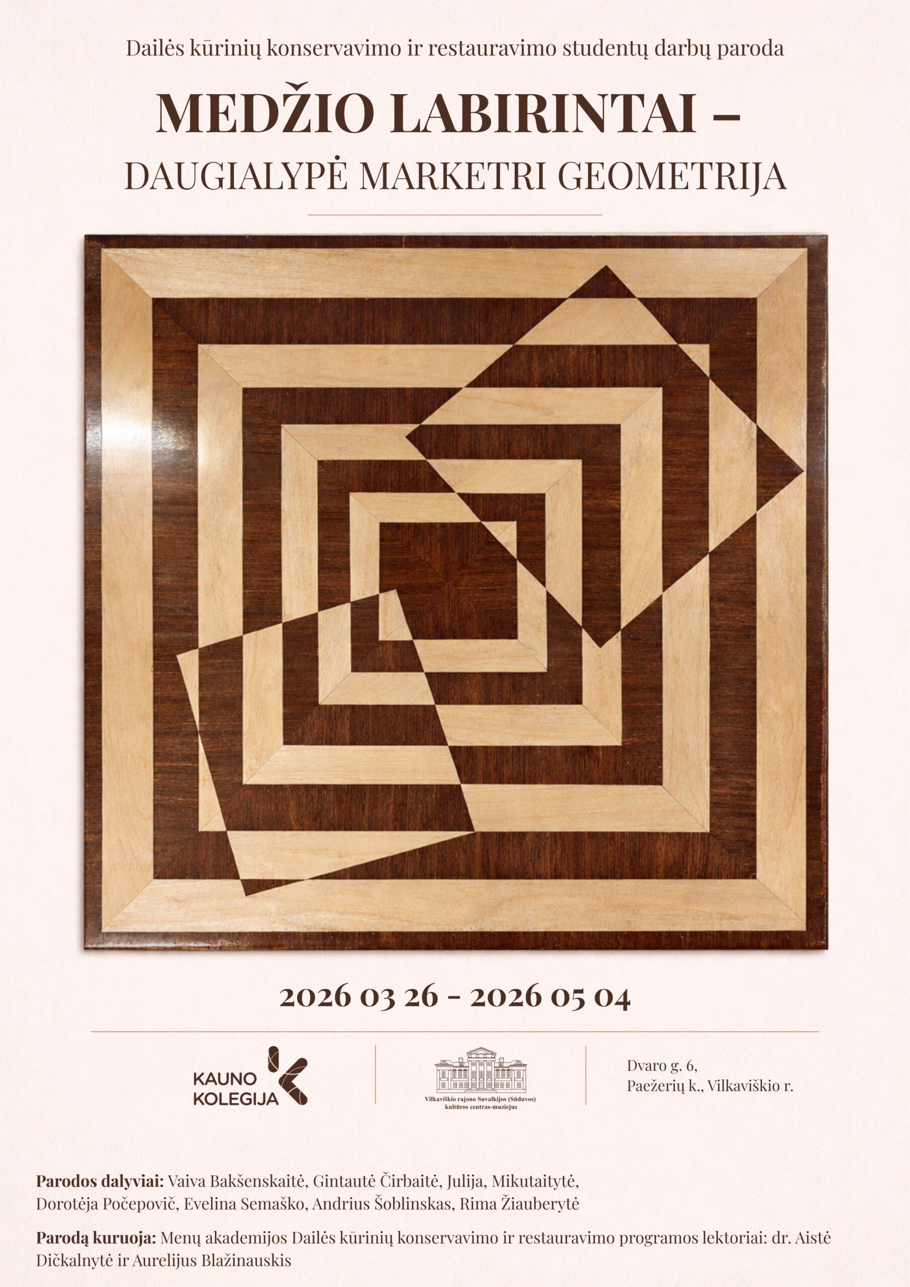 Dailės kūrinių konservavimo ir restauravimo studentų darbų paroda MEDŽIO LABIRINTAI – DAUGIALYPĖ MARKETRI GEOMETRIJA Paežerių dvare veiks 2026 03 26 – 2026 05 04.